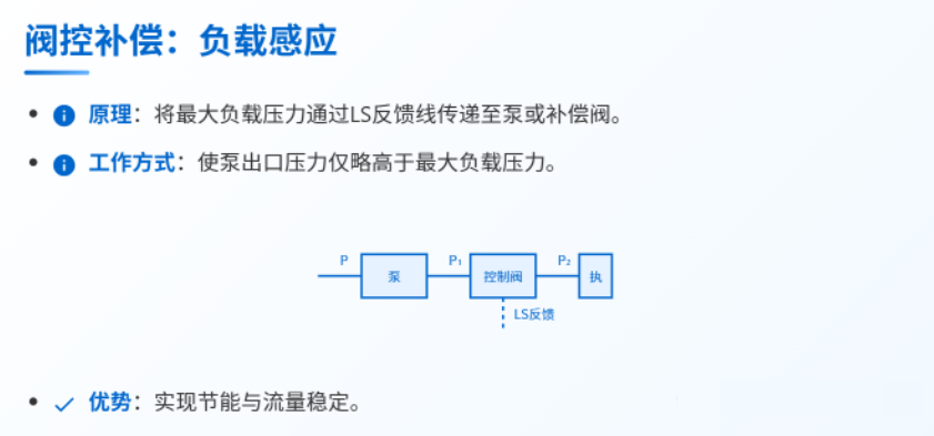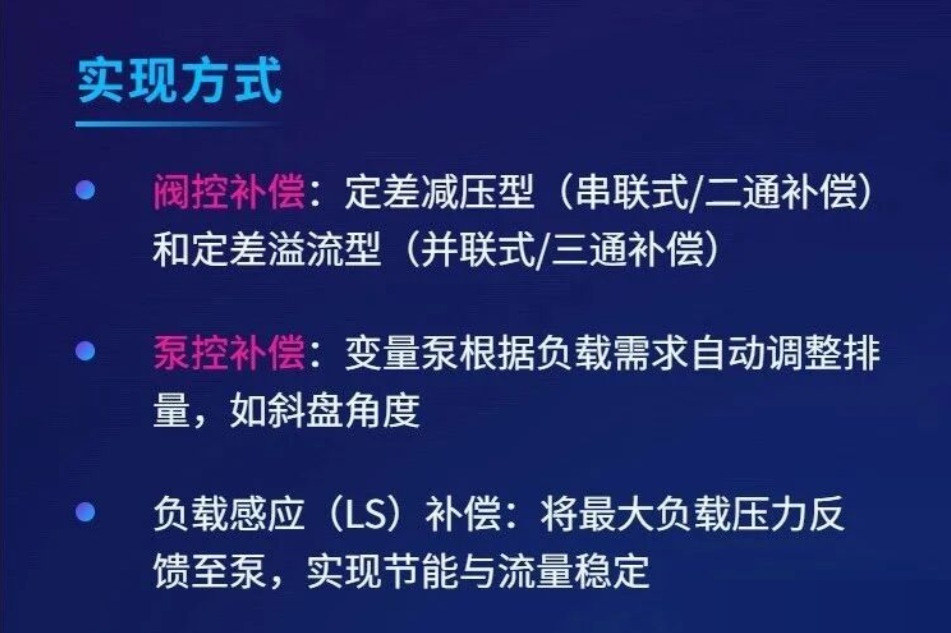 為了解決這一關鍵問題,確保執(zhí)行元件在負載變化時仍能獲得相對恒定的流量(從而保持穩(wěn)定的速度),工程師們引入了壓力補償這一核心技術。壓力補償是指液壓系統(tǒng)中采取特定措施,主動抵消或平衡因負載變化引起的壓力波動,從而維持關鍵工作參數(shù)(特別是流量)相對穩(wěn)定的過程和方法。