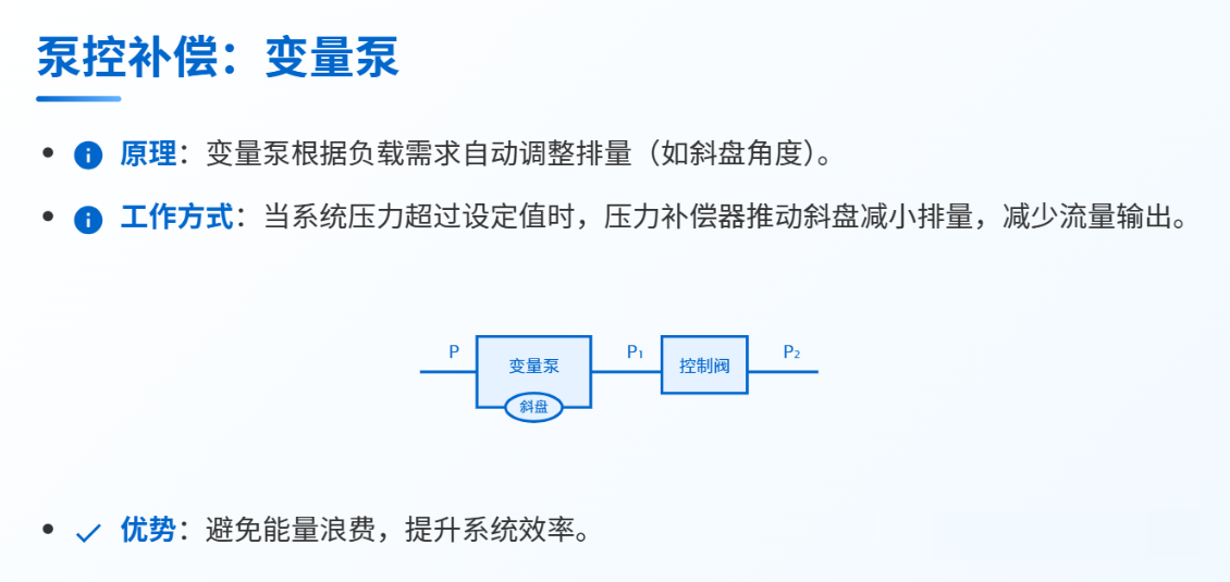 定義: 液壓系統(tǒng)中,通過自動調節(jié)系統(tǒng)參數(shù)(如閥口開度或泵排量),維持節(jié)流閥前后壓差(△P)的恒定,從而確保通過閥口的流量穩(wěn)定,不受負載壓力波動的影響。